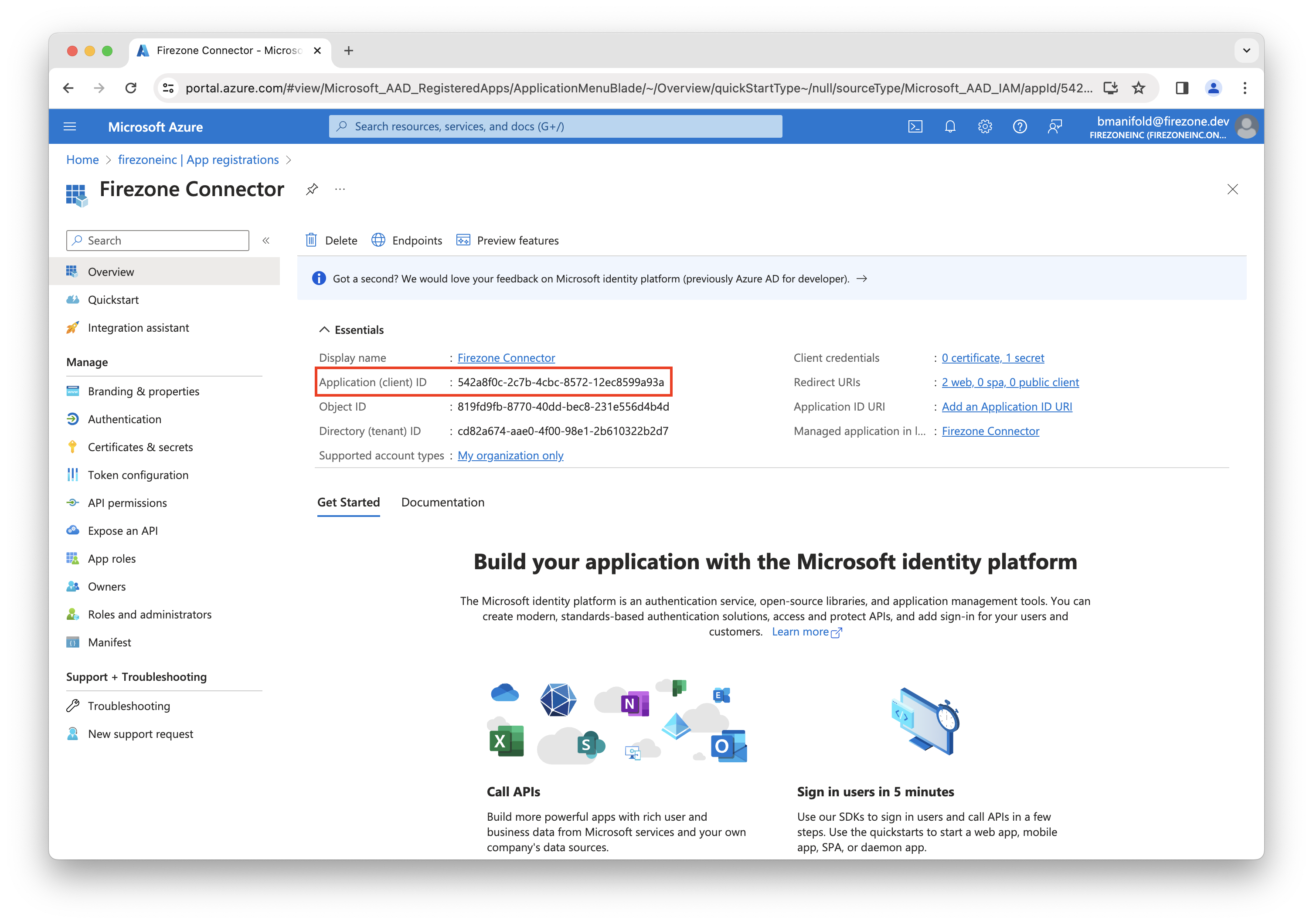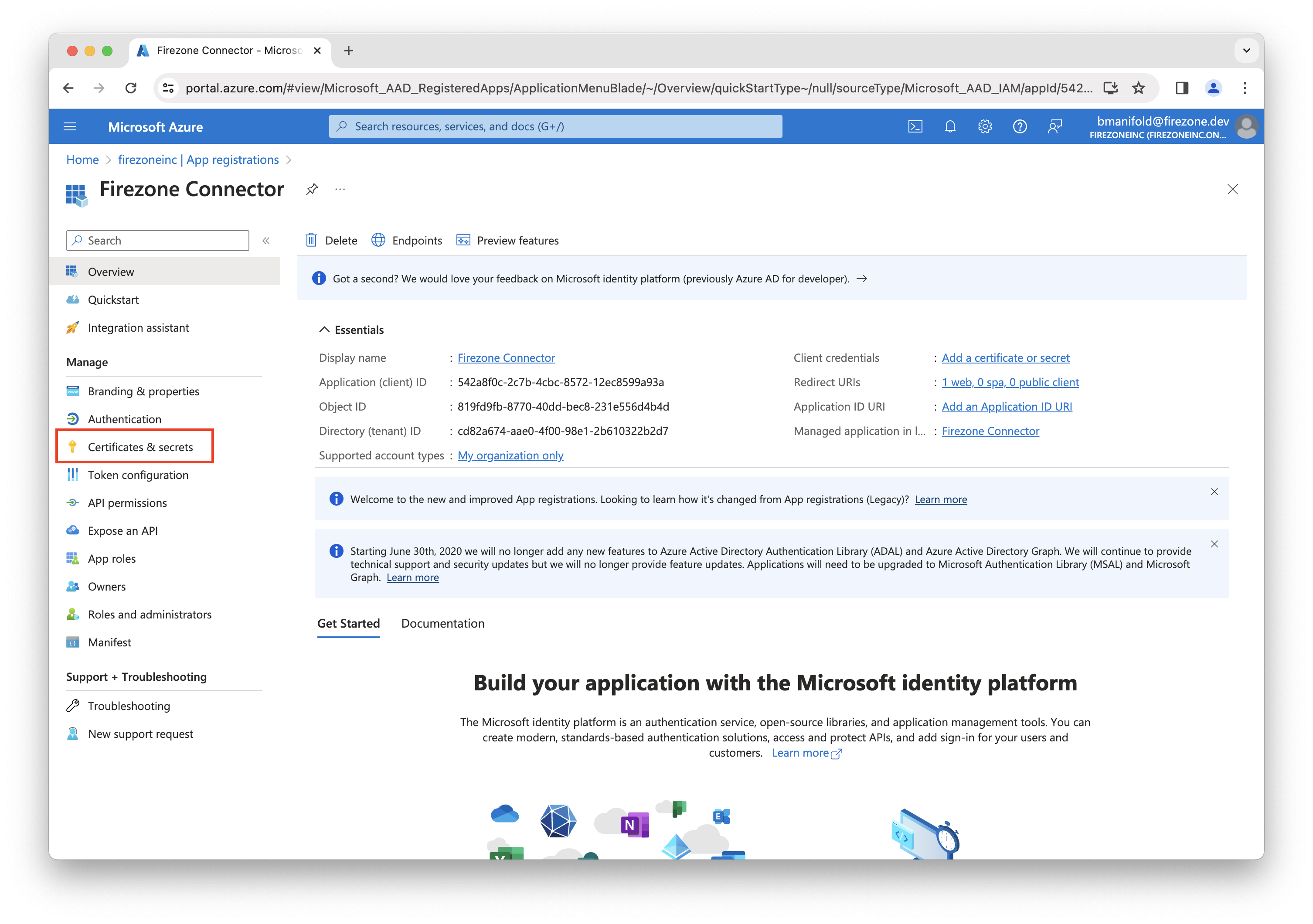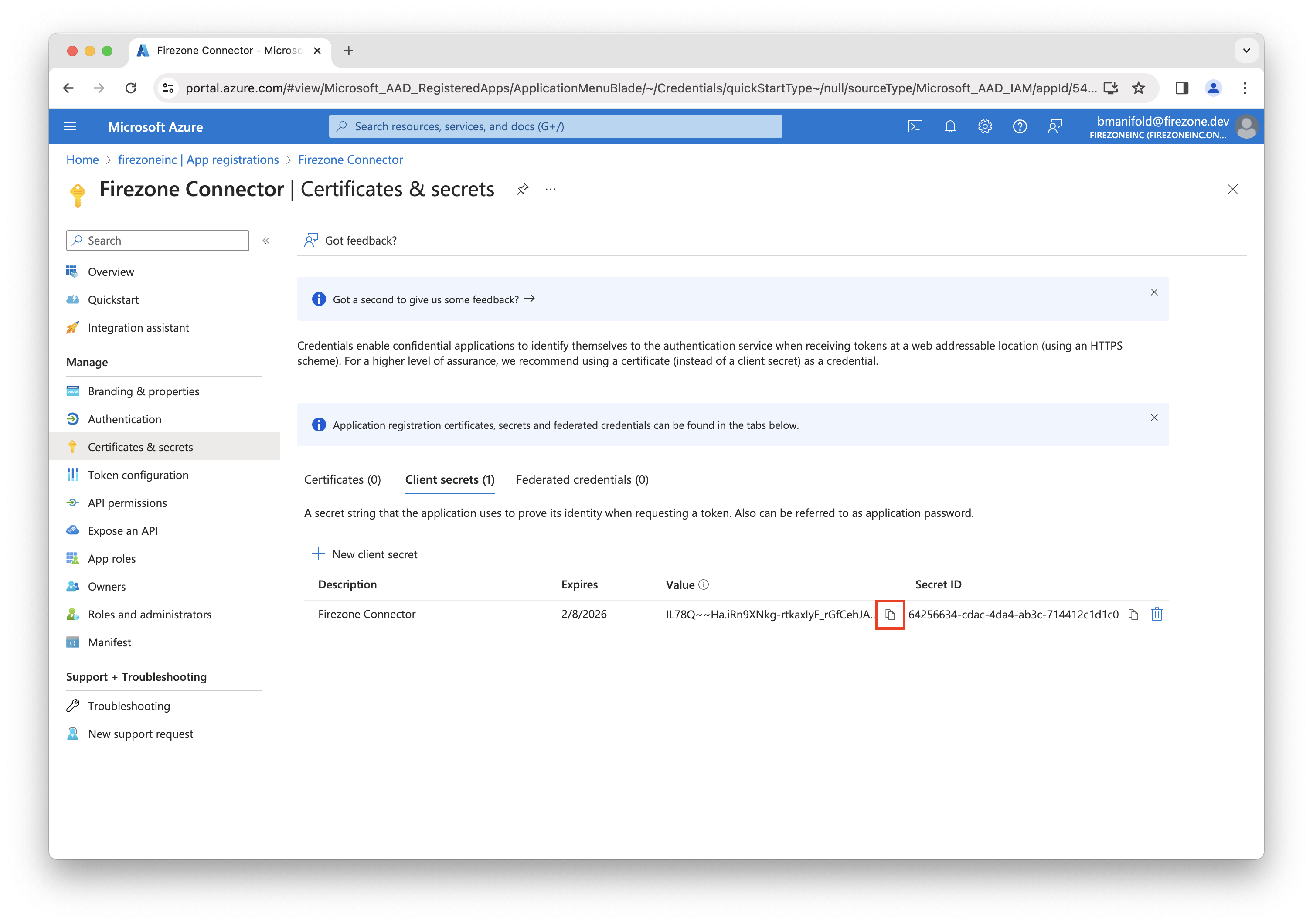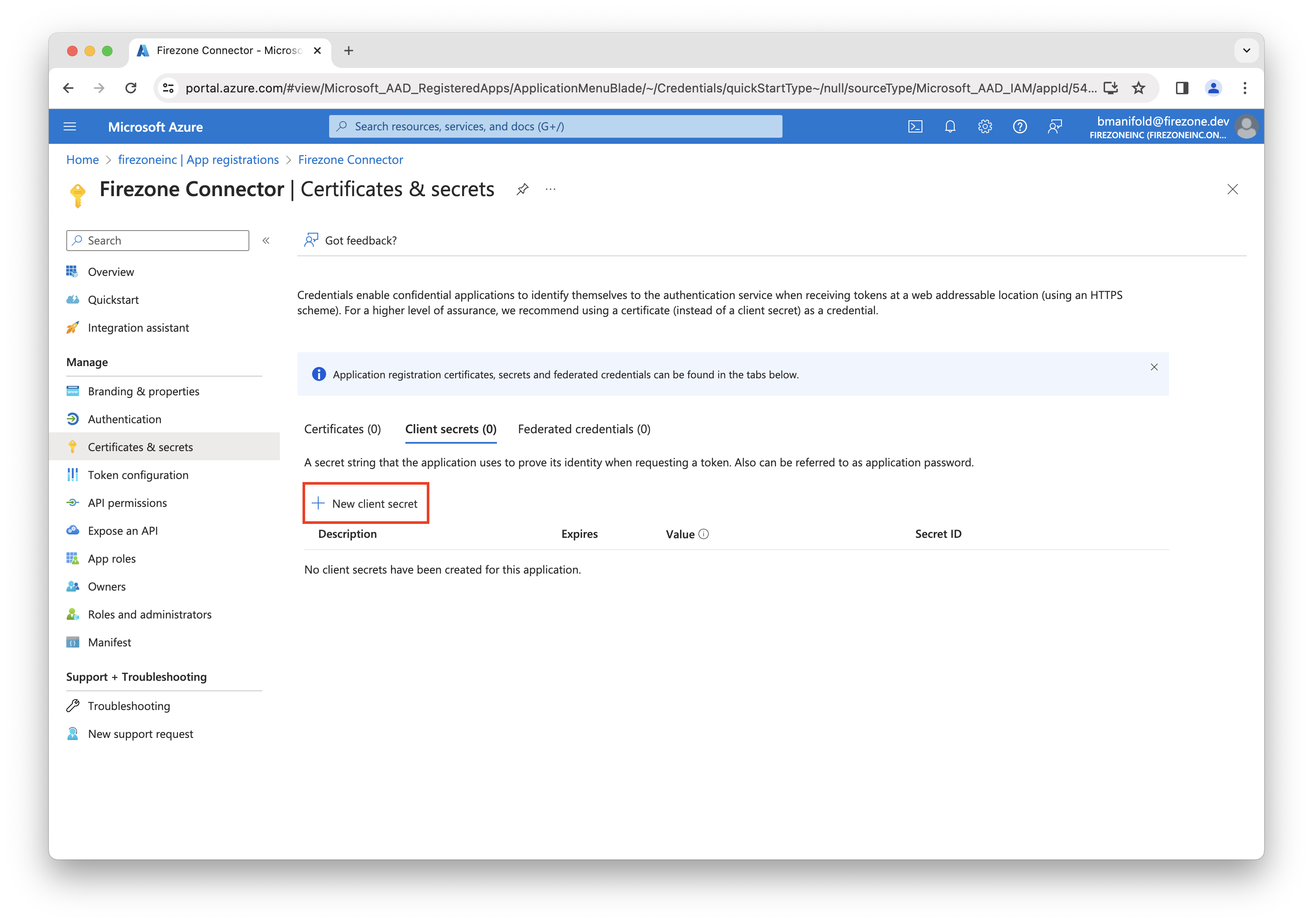 Back on the Firezone Connector app registration page, click Certificates & secrets in the left sidebar.