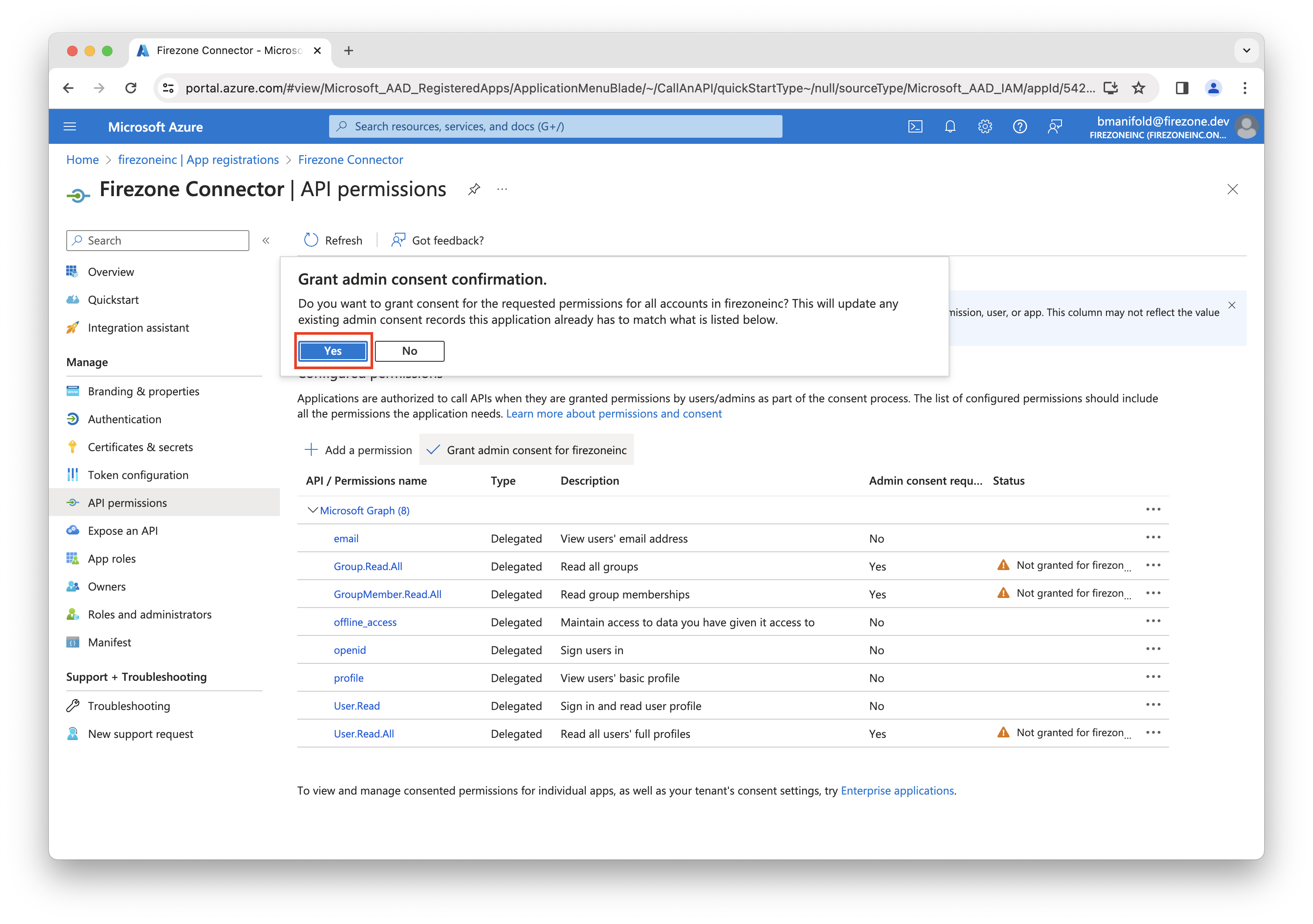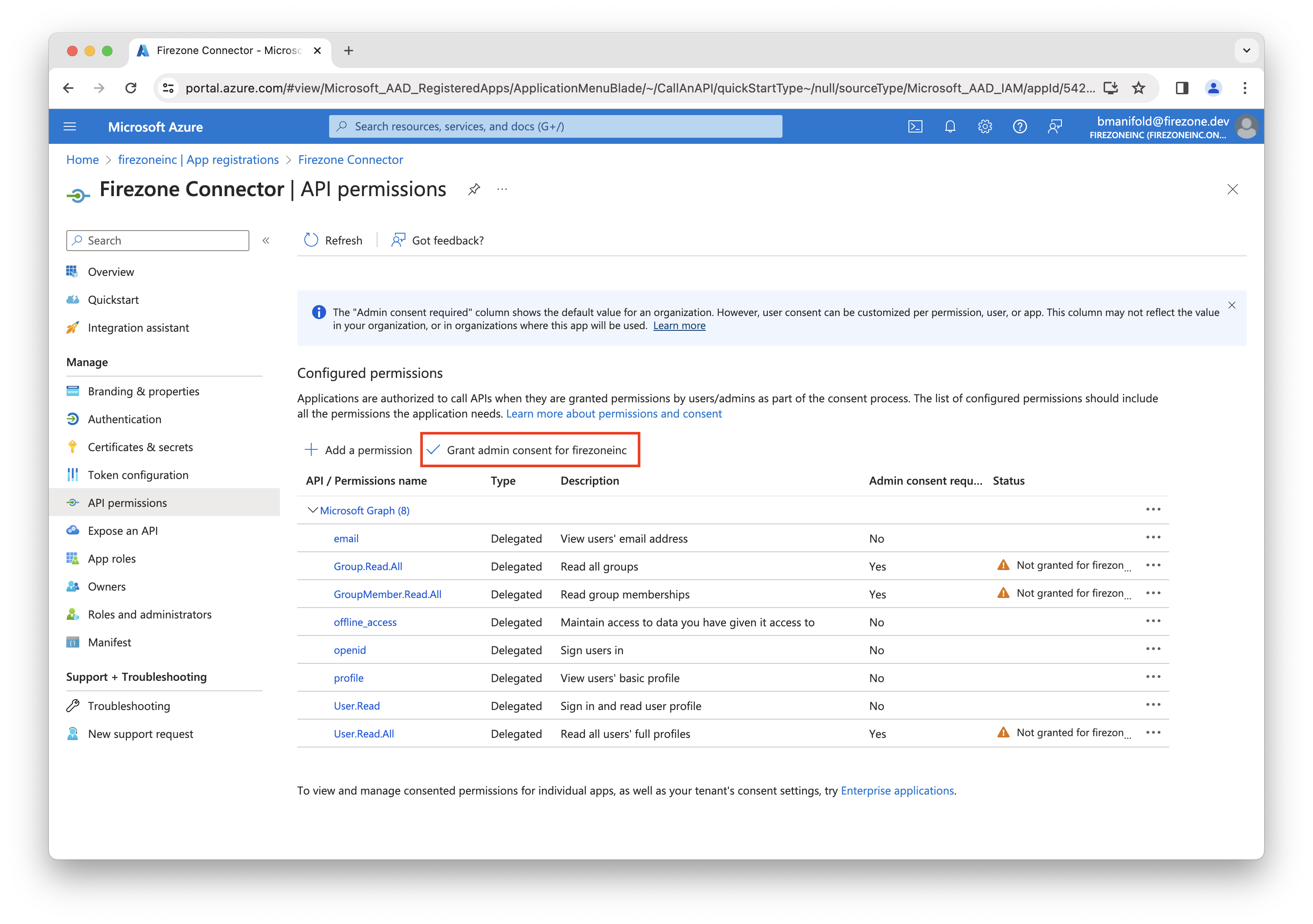 On the following screen, click Grant admin consent for