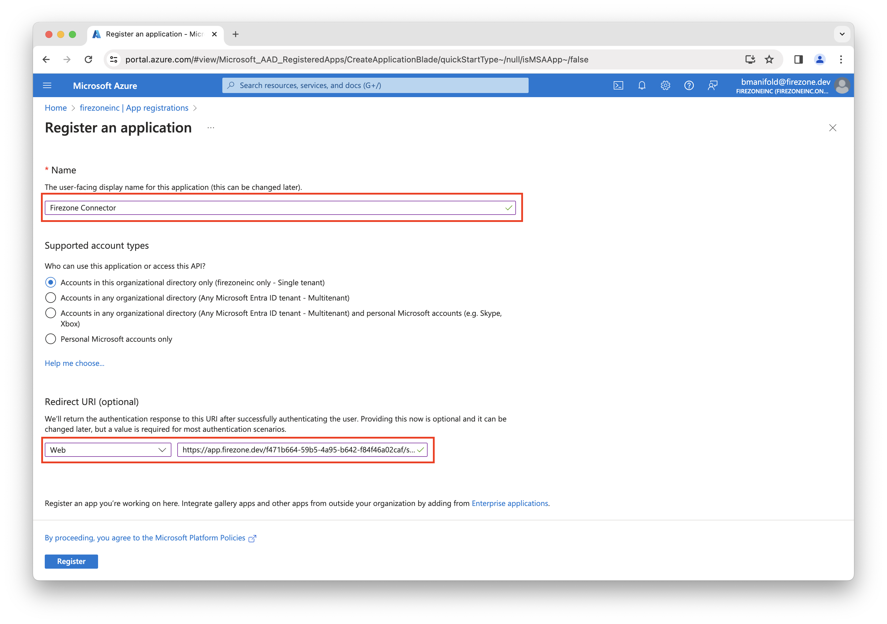 the app registration to enter into the Firezone admin portal.